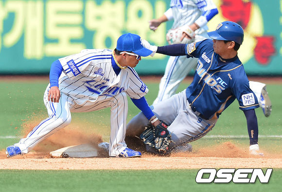 1회초 NC 공격 1사 1루 상황 김종호가 2루 도루에 성공하고 있다.