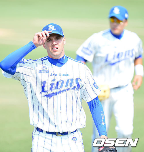 2회초 NC 공격 때 조영훈에게 선제 투런포를 허용한 삼성 선발 밴덴헐크가 이닝을 마치고 더그아웃으로 들어오고 있다.