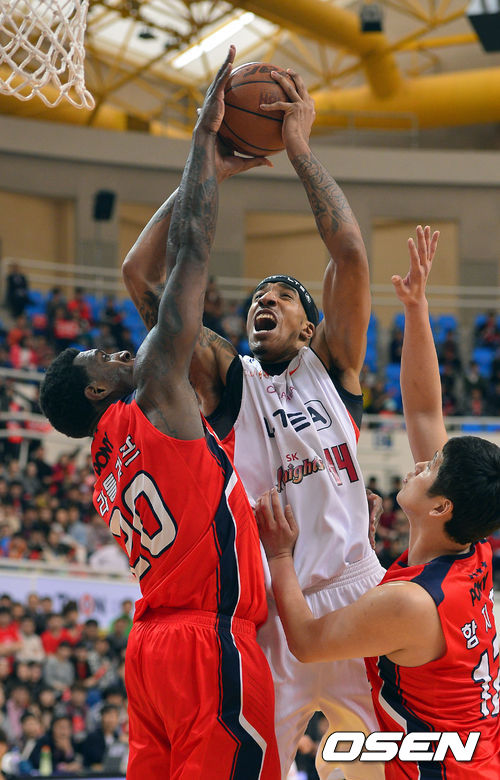 23일 오후 울산시 동천실내체육관서 열린 '2013-2014 KB국민카드 프로농구' 4강 플레이오프 1차전 울산 모비스와 서울 SK의 경기 1쿼터 SK 심스가 골밑슛을 시도하고 있다