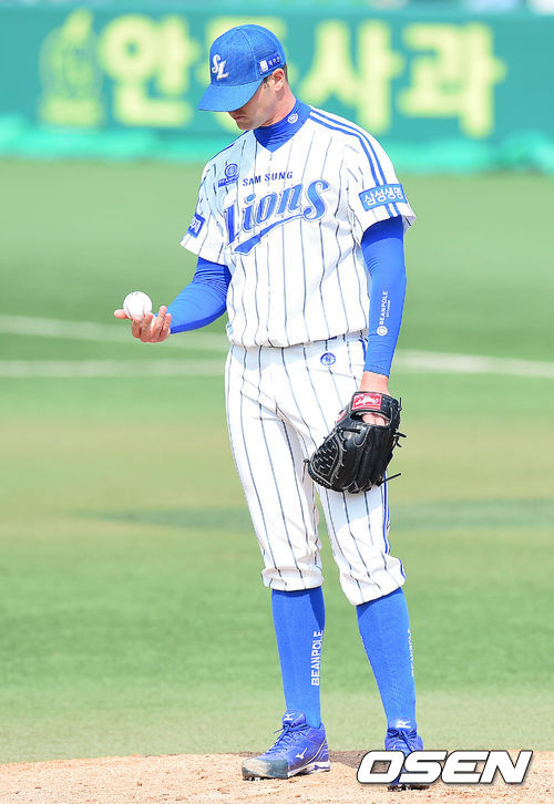 4회초 NC 공격 2사 2루 상황 삼성 선발 밴덴헐크가 보크 선언을 당한 뒤 공을 만지고 있다.