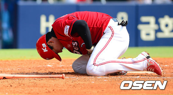 5회초 1사 2루 KIA 신종길이 LG 임지섭의 투구에 손가락을 맞아 고통스러워하고 있다.