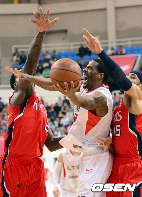 23일 오후 울산시 동천실내체육관서 열린 '2013-2014 KB국민카드 프로농구' 4강 플레이오프 1차전 울산 모비스와 서울 SK의 경기 1쿼터 SK 헤인즈가 파울을 얻어내고 있다