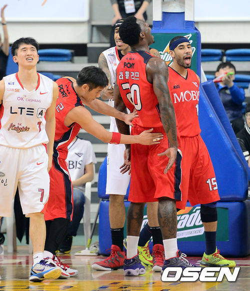 23일 오후 울산시 동천실내체육관서 열린 '2013-2014 KB국민카드 프로농구' 4강 플레이오프 1차전 울산 모비스와 서울 SK의 경기 1쿼터 모비스 라틀리프가 바스켓카운트를 얻은 후 환호하고 있다.