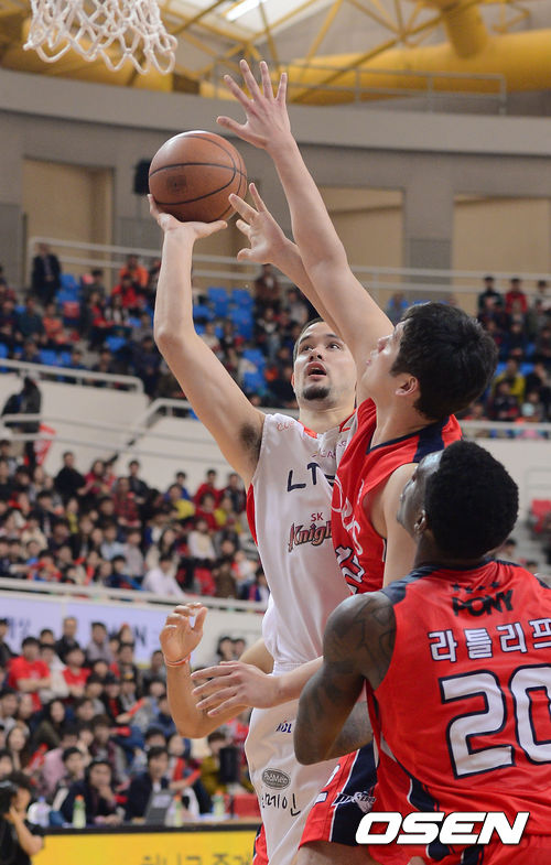 23일 오후 울산시 동천실내체육관서 열린 '2013-2014 KB국민카드 프로농구' 4강 플레이오프 1차전 울산 모비스와 서울 SK의 경기 1쿼터 SK 김민수가 슛을 시도하고 있다.