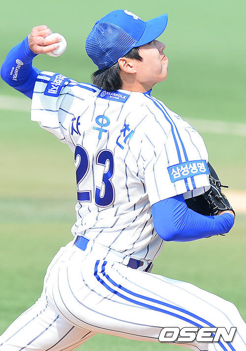 6회초 NC 공격 마운드에 오른 삼성 투수 차우찬이 힘차게 공을 뿌리고 있다.