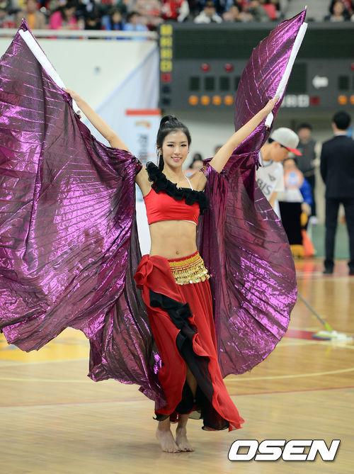 23일 오후 울산시 동천실내체육관서 열린 '2013-2014 KB국민카드 프로농구' 4강 플레이오프 1차전 울산 모비스와 서울 SK의 경기 2쿼터 작전타임때 모비스 치어리더가 멋진 무대를 펼치고 있다.