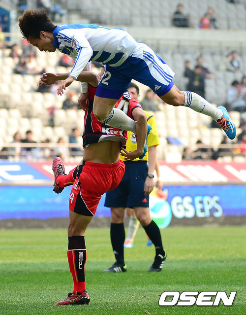 후반, 서울 박희성과 공중볼을 다투던 부산 박준강이 공중에서 떨어지고 있다.