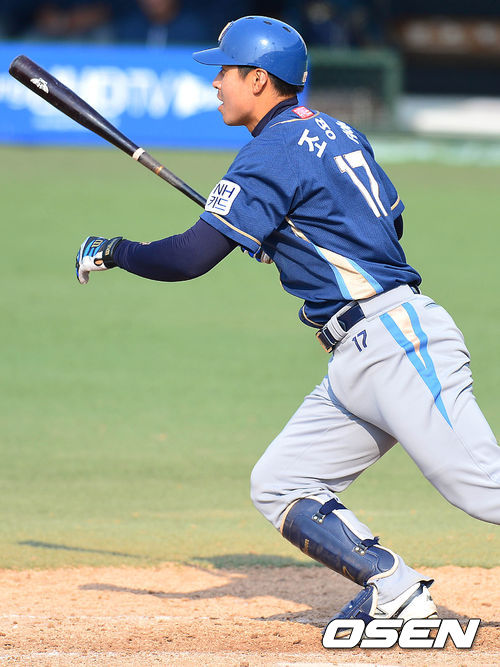 9회초 NC 공격 선두타자로 나선 조영훈이 우전안타를 날리고 있다.