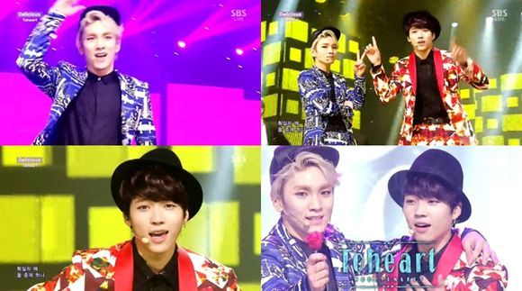 투하트는 23일 방송된 SBS 가요프로그램 '인기가요'에 출연해 활동 중인 곡 '딜리셔스(delicious)'를 불렀다. 화려한 무늬의 캐주얼 슈트를 입고 등장한 이들은 눈 호강시키는 비주얼로 무대를 종횡무진하며 시선을 집중시켰다.