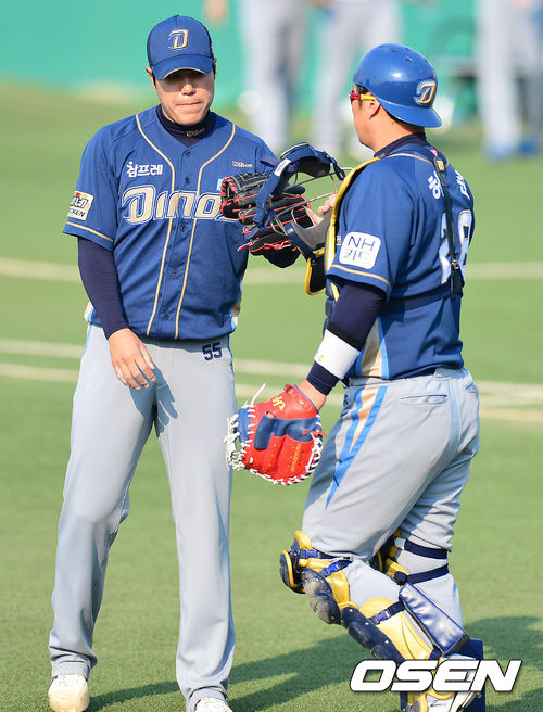 9회말 삼성 공격 마운드에 올라 삼자범퇴로 경기를 매조지한 NC 투수 김진성과 포수 허준이 인사를 나누고 있다./dreamer@osen.co.kr