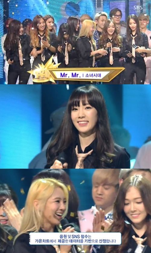 소녀시대는 23일 방송된 '인기가요'에서 '미스터 미스터(Mr. Mr.)로 1위를 받았다. 수상자로 호명된 후 효연은 "깜짝 놀랐다"고 소감을 밝혔으며, 태연은 "열심히 투표해주는 우리 소원(팬클럽) 고맙다"고 인사했다.