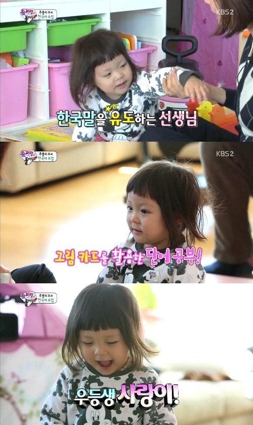 추사랑은 23일 오후 방송된 KBS 2TV 예능프로그램 '해피선데이-슈퍼맨이 돌아왔다'에서 선생님과 함께 한국어 수업에 나섰다. 예전보다 한층 성장한 한국어 실력이 눈길을 사로잡았다.
