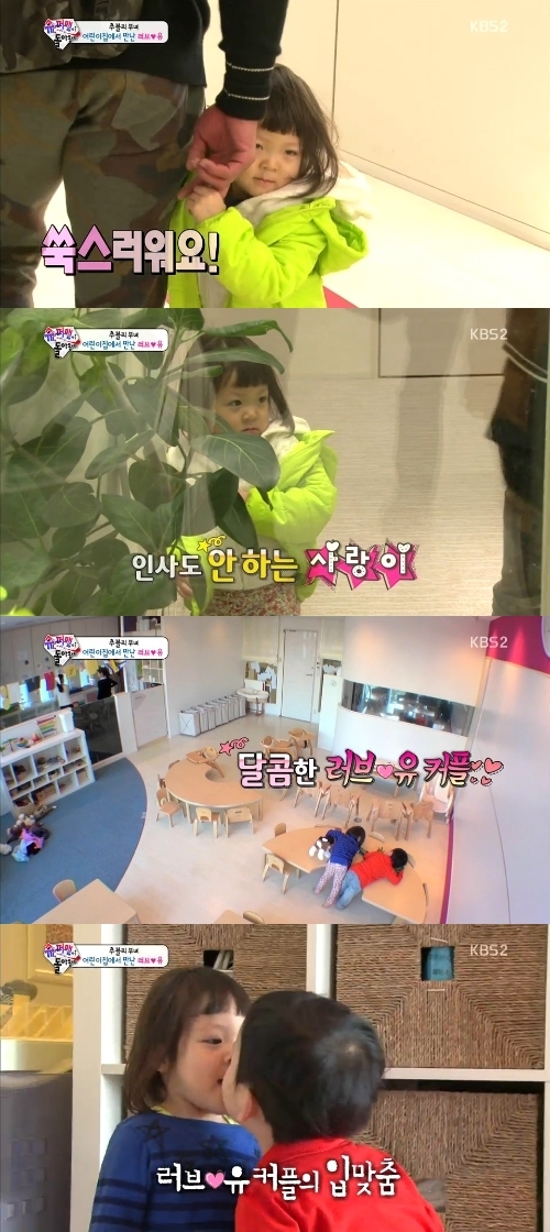 23일 오후 방송된 KBS 2TV 예능프로그램 '해피선데이-슈퍼맨이 돌아왔다'에서 추사랑은 아빠 추성훈과 함께 어린이집으로 등원했다. 사랑은 어린이 집에서 남자친구 유토를 만나 수줍음을 감추지 못했다.