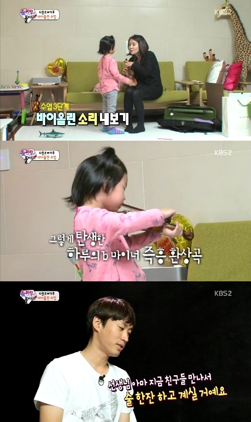 이하루는 23일 오후 방송된 KBS 2TV 예능프로그램 '해피선데이-슈퍼맨이 돌아왔다'에서 처음으로 바이올린 수업을 받게 됐다. 미모의 바이올린 선생님은 하루를 위해 다양한 프로그램들을 준비해 왔지만 자유로운 하루에게 알려주기 위해 고군분투했다.