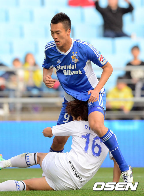 23일 오후 울산 문수월드컵경기장에서 열린 ‘현대오일뱅크 K리그 클래식 2014’ 울산 현대와 인천 유나이티드의 경기 후반 울산 김신욱이 슈팅 후 인천 이윤표와 충돌하고 있다