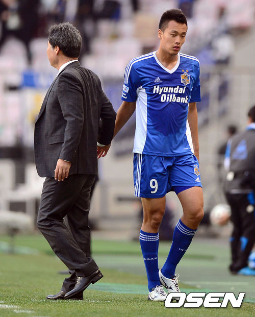 23일 오후 울산 문수월드컵경기장에서 열린 ‘현대오일뱅크 K리그 클래식 2014’ 울산 현대와 인천 유나이티드의 경기 후반 울산 김신욱이 교체되며 조민국 감독과 하이파이브를 하고 있다
