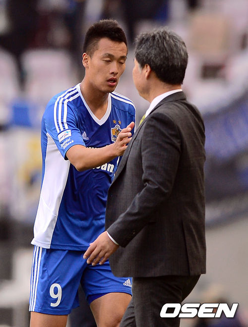23일 오후 울산 문수월드컵경기장에서 열린 ‘현대오일뱅크 K리그 클래식 2014’ 울산 현대와 인천 유나이티드의 경기 후반 울산 김신욱이 교체되며 조민국 감독과 하이파이브를 하고 있다