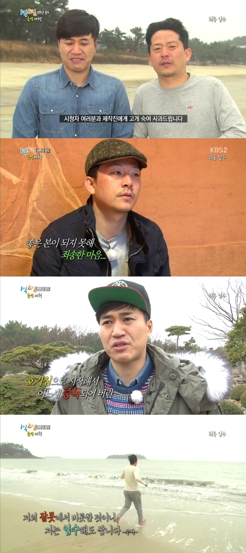 23일 오후 방송된 KBS 2TV 예능프로그램 '해피선데이-1박 2일'에서 김준호, 김종민, 김주혁은 금연 여행 중 흡연을 한 대가로 추운 겨울바다에 몸을 던지며 여행의 대미를 장식했다.