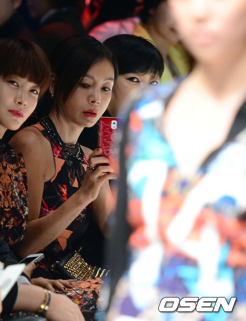 23일 오후 서울 동대문 디자인 플라자에서 열린 '2014 F/W 서울패션위크 박윤희 컬렉션'에서 황신혜가 딸 이진이(박지영)을 휴대폰으로 촬영하고 있다.