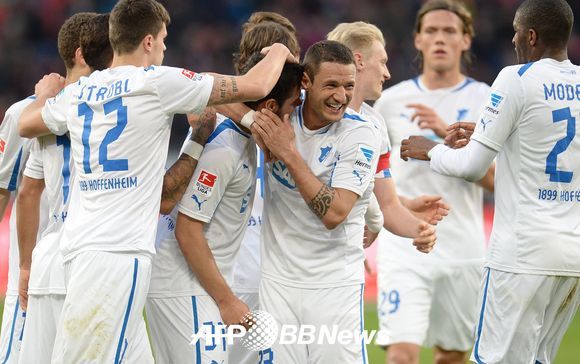 [OSEN=스포츠부] 호펜하임의 케빈 볼란트가 멋진 감아차기로 득점에 성공한 뒤 세야드 살리호비치를 비롯한 동료들의 축하를 받고 있다.