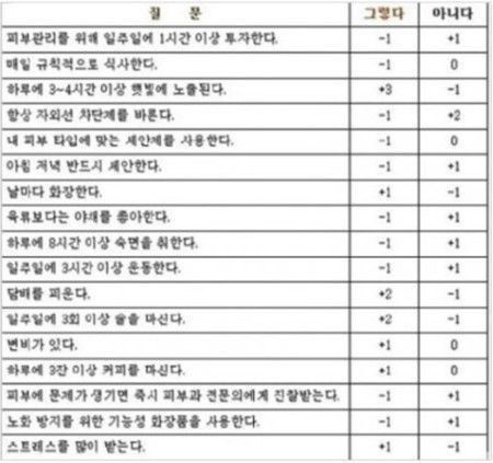 내 피부 나이 자가 진단법은 다음과 같다. 변비가 있다/담배를 피운다/날마다 화장한다/아침 저녁 반드시 세안한다 등 모두 17개 항목에 따라 점수를 매긴다.
