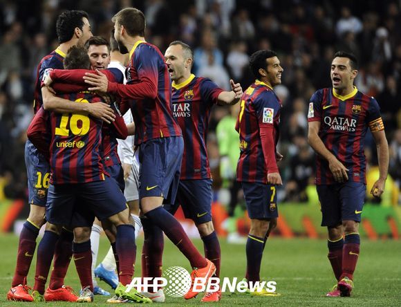 FC 바르셀로나는 24일 새벽 (이하 한국시간) 산티아고 베르나베우에서 열린 2013-2014시즌 스페인 프리메라리가 29라운드에서 3골을 터트린 메시를 앞세워 레알 마드리드를 4-3으로 제압했다. 승점 69점이 된 바르셀로나는 2위 레알 마드리드(승점 70점)를 한 점 차로 바짝 추격하며 우승 가능성을 남겼다.