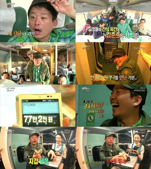 이날 김준호는 자신만만한 표정으로 퀴즈를 풀기 시작했지만 결국 꼴찌가 돼 눈물을 머금고 승객들에게 간식을 사야만 했다. 또 그는 함께 목표했던 손님들에게 간식을 시간 내에 제공하지 못해 열차에서 못 내리고 낙오되는 굴욕을 겪었다.