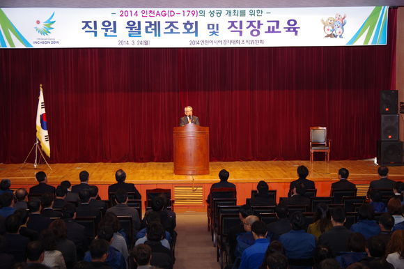 2014 인천아시경기대회 조직위원회(위원장 김영수)는 24일 인천 송도 갯벌타워 2층 국제회의장에서 조직위 전직원을 대상으로 월례조회 및 직장교육을 실시했다.