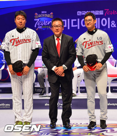 24일 오후 서울 이화여대 ECC 삼성홀에서 대현동 2014 한국야쿠르트 세븐 프로야구 미디어데이가 열렸다. LG 류제국 김기태 감독 박용택이 인사를 하고 있다.김