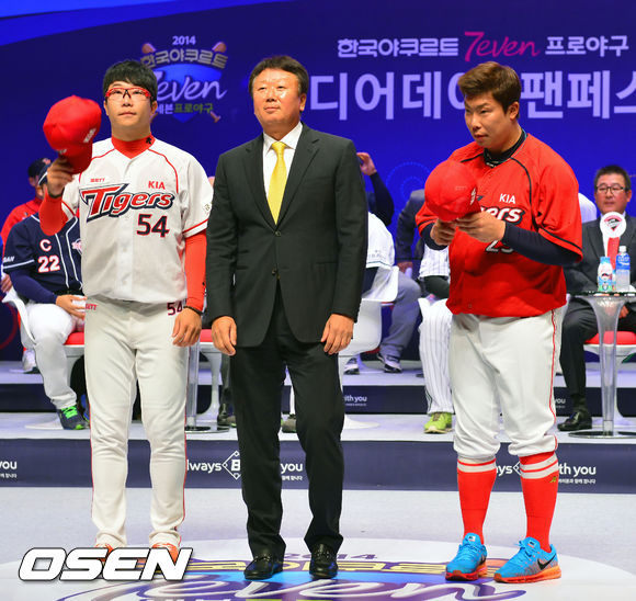 24일 오후 서울 이화여대 ECC 삼성홀에서 대현동 2014 한국야쿠르트 세븐 프로야구 미디어데이가 열렸다. 양현종 선동열 감독 나지완이 포토타임을 갖고 있다.