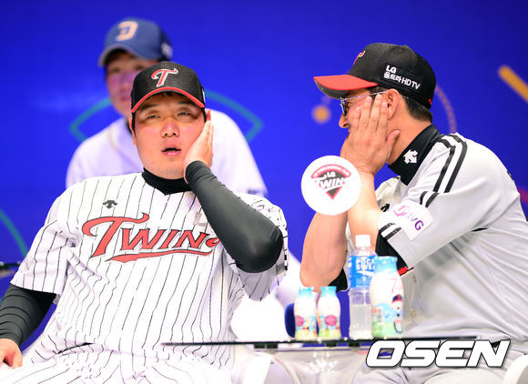 24일 오후 서울 이화여대 ECC 삼성홀에서 대현동 2014 한국야쿠르트 세븐 프로야구 미디어데이가 열렸다. 기자회견 중 LG 류제국과 박용택이 쑥스러워하고 있다.