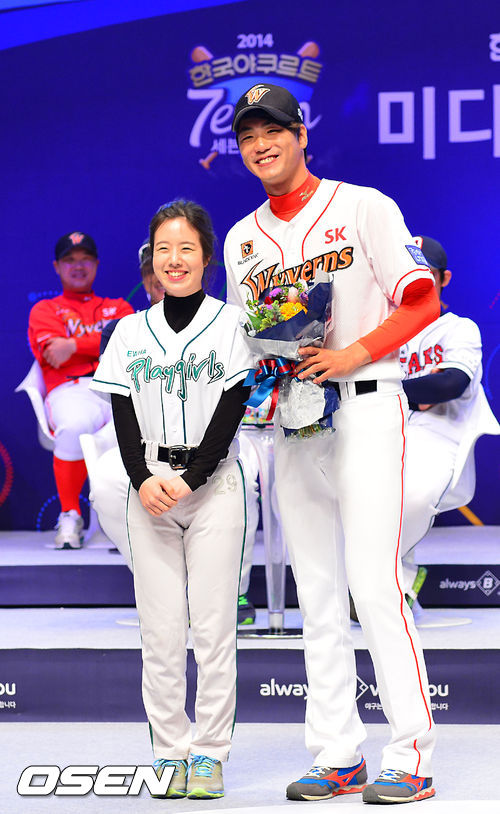 24일 오후 서울 이화여대 ECC 삼성홀에서 대현동 2014 한국야쿠르트 세븐 프로야구 미디어데이가 열렸다. 여대생 인기 투표에 1위로 뽑힌 김광현이 포토타임을 갖고 있다.