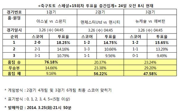 국민체육진흥공단(www.kspo.or.kr)이 발행하는 체육진흥투표권 수탁사업자인 스포츠토토 공식 온라인 발매 사이트인 베트맨(www.betman.co.kr)은 오는 26일 열리는 아스날-스완지 시티(1경기), 맨체스터 유나이티드-맨체스터 시티(2경기), 뉴캐슬-에버턴(3경기)전 등 잉글랜드 프리미어리그 3경기를 대상으로 한 축구토토 스페셜+ 15회차 투표율 중간집계 결과, 축구팬의 절반이 넘는 56.22%는 맨체스터 유나이티드-맨체스터 시티(2경기)전에서 맨체스터 시티의 승리를 예상했다.