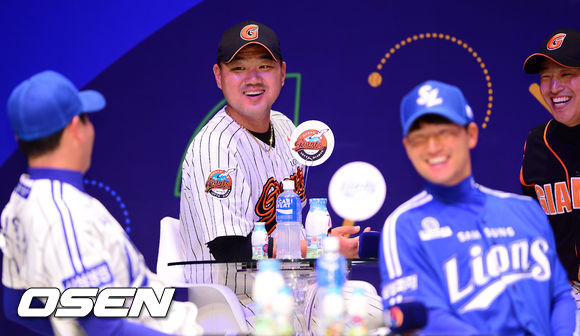 24일 오후 서울 이화여대 ECC 삼성홀에서 대현동 2014 한국야쿠르트 세븐 프로야구 미디어데이가 열렸다. 롯데 송승준 손아섭 삼성 장원삼 김상수가 즐겁게 얘기를 나누고 있다.