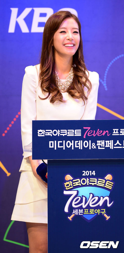 24일 오후 서울 이화여대 ECC 삼성홀에서 대현동 2014 한국야쿠르트 세븐 프로야구 미디어데이가 열렸다. 사회를 맡은 배지현 아나운서가 환하게 웃고 있다.