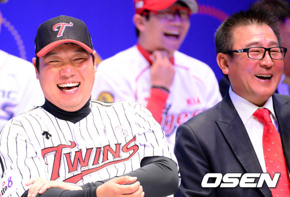 LG 류제국과 김기태 감독이 미디어데이 행사에서 환하게 웃고 있다.