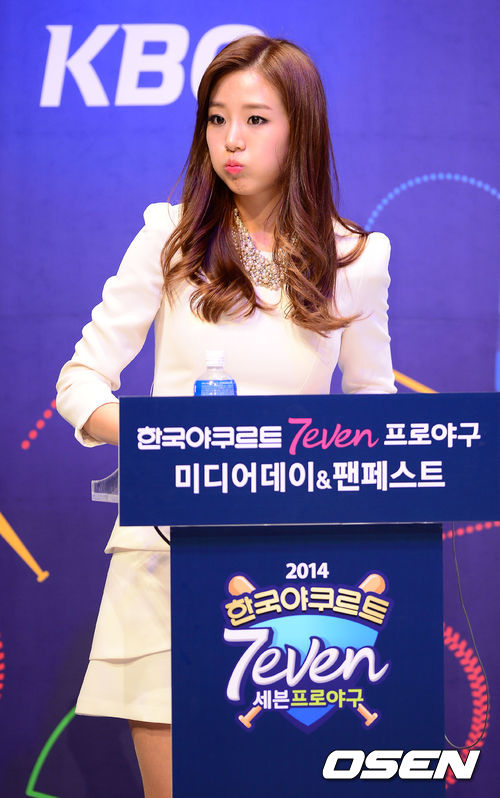 24일 오후 서울 이화여대 ECC 삼성홀에서 대현동 2014 한국야쿠르트 세븐 프로야구 미디어데이가 열렸다. 사회를 맡은 배지현 아나운서가 볼에 바람을 넣고 있다.