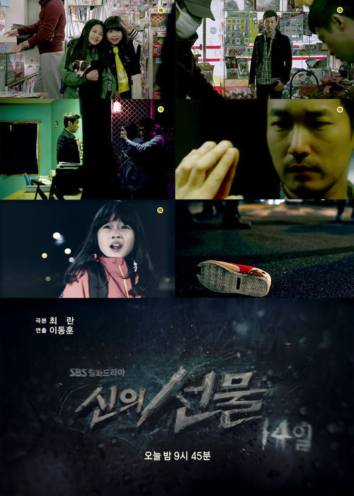 '신의 선물-14일'은 유괴된 딸을 살리기 위해 2주전으로 타임워프된 엄마 김수현(이보영 분)과 전직 형사 기동찬(조승우 분)이 의문의 납치범과 벌이는 치열한 두뇌게임을 그려가고 있는 미스터리 감성 스릴러 드라마로 이보영, 조승우, 김태우, 정겨운, 신구 등이 열연하고 있다.