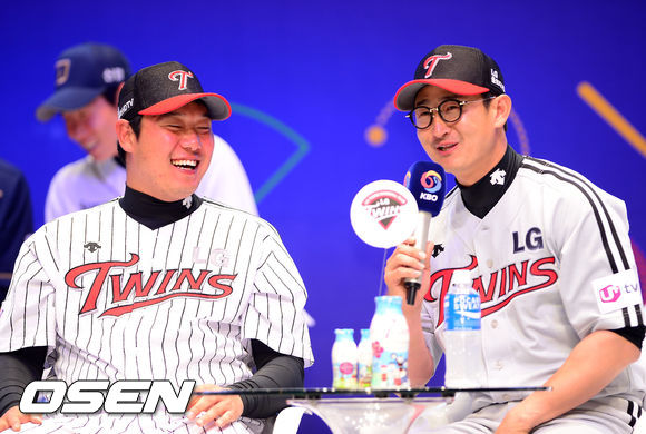 LG 박용택이 야쿠르트에 인쇄된 캐릭터가 자신을 닮았다고 농담을 하자 류제국이 환하게 웃고 있다.