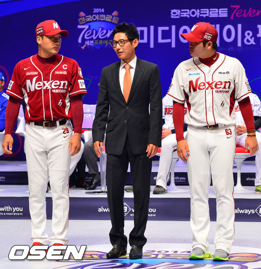 24일 오후 서울 이화여대 ECC 삼성홀에서 대현동 2014 한국야쿠르트 세븐 프로야구 미디어데이가 열렸다. 넥센 이택근과 한현희가 염경엽 감독을 바라보고 있다.