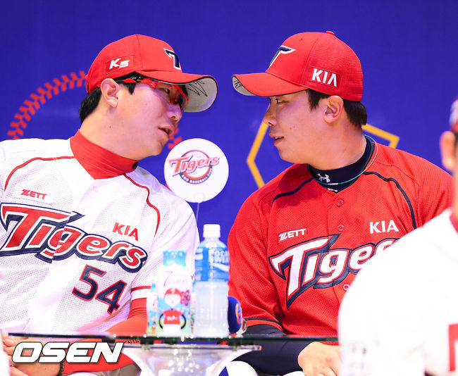 24일 오후 서울 이화여대 ECC 삼성홀에서 대현동 2014 한국야쿠르트 세븐 프로야구 미디어데이가 열렸다. KIA 양현종과 나지완이 얘기를 나누고 있다.