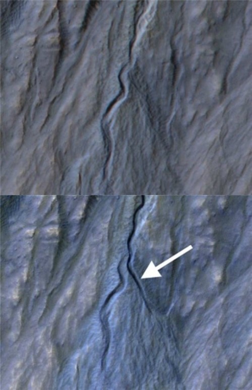 두 사진을 비교해 보면 2010년 당시에는 발견되지 않았던 화성 협곡이 2013년에는 선명하게 길게 뻗어있는 모습을 발견할 수 있다.