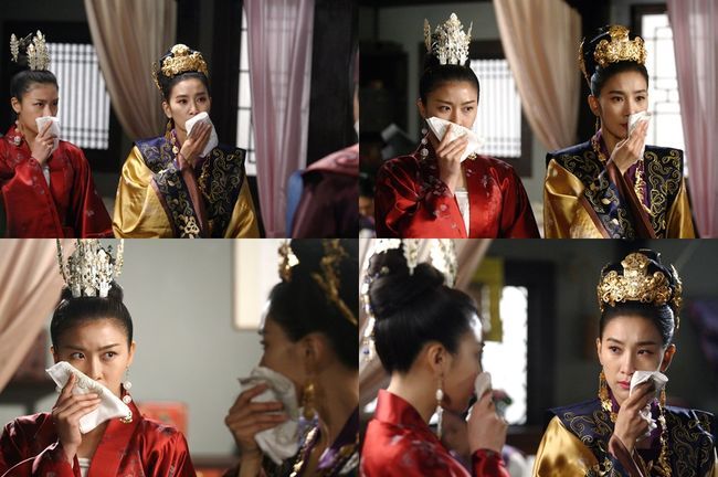 25일 공개된 사진 속 MBC 월화드라마 ‘기황후’ 기승냥(하지원 분)과 황태후(김서형 분)는 코와 입을 손수건으로 막고 있다.