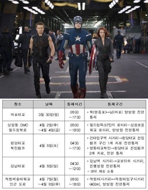 '어벤져스2'는 오는 30일부터 4월 14일까지 서울의 마포대교, 세빛둥둥섬, 상암동 디지털미디어시티 월드컵 북로, 청담대교, 강남대로 일부, 문래동 철강거리, 경기도 의왕시 계원예술대학교 인근 도로 등에서 촬영이 진행될 예정이다.