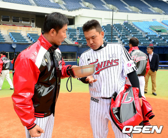 LG 류택현, 윤요섭이 고사를 마치고 음복을 하고 있다.