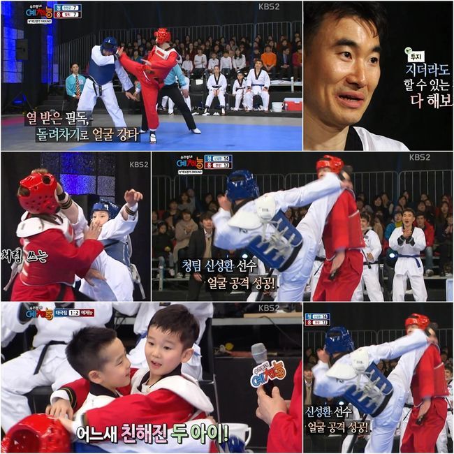 이날 가장 먼저 대결을 펼쳤던 인물은 강호동과 김병철 선수였다. 6개월의 파란띠 김병철 선수와 태권도 입문 2주에 불과한 전직 천하장사 강호동의 대결은 접전의 연속이었다. 씨름선수 특유의 집념을 발휘한 강호동은 회심의 발차기를 성공시키며 연장전까지 가는 접전을 펼쳐 보였다. 특히 천하장사 출신인 강호동의 집요한 공격에도 끝까지 포기를 하지 않은 김병철 선수는 결국 연장전에서 첫 1점을 따는데 성공했다.