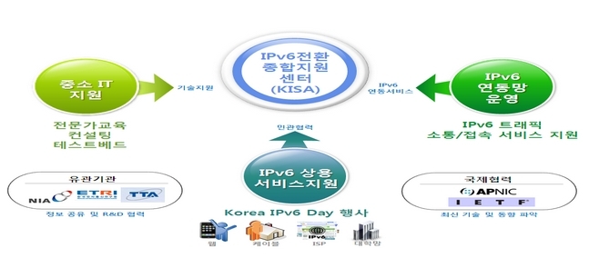 여기에 모든 사업자가 로드맵을 공유·협력하고 정부는 IPv6 전환 촉진 지원사업, 제도‧인프라 확충 등을 통해 뒷받침하는 추진체계를 마련하였다.