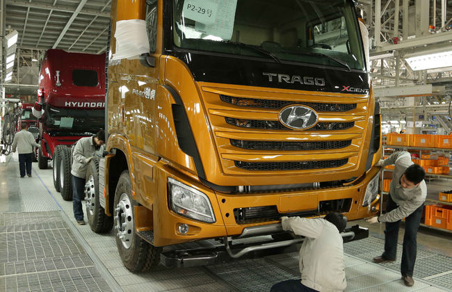 상반기 중 완공을 앞두고 있는 쓰촨현대 상용차 공장에서 대형 트럭 트라고 엑시언트가 시험생산 되고 있다. /현대차 제공.
