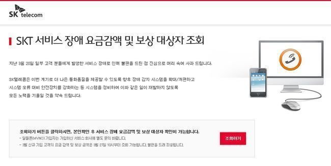 SKT는 지난 20일 발생한 통신장애에 관한 공식 보상금액 조회시스템을 연다고 밝혔다. 이에 SK텔레콤은 25일 오후 6시부터 자사 가입자들이 통신장애 관련 보상금액을 간편하게 확인할 수 있는 별도의 조회시스템을 열 예정이다.