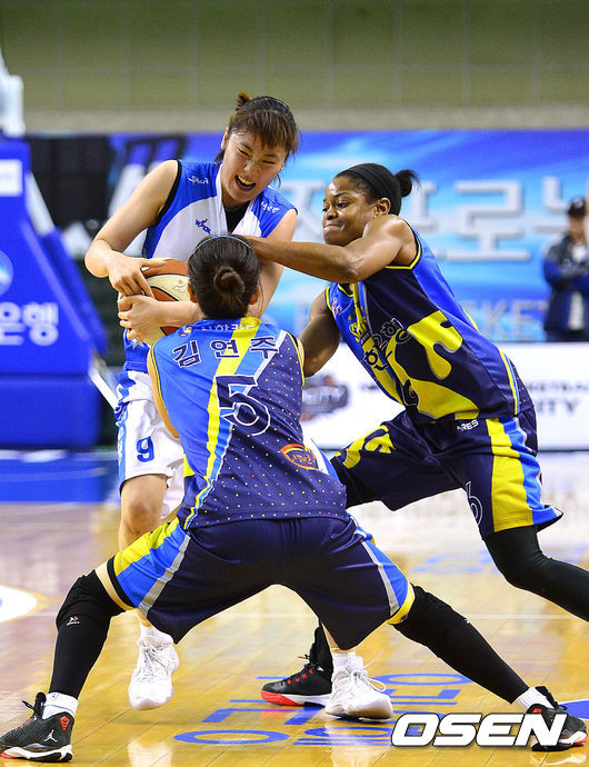2쿼터, 신한은행 비어드와 김연주가 우리은행 박혜진을 더블팀 수비로 막아서고 있다.